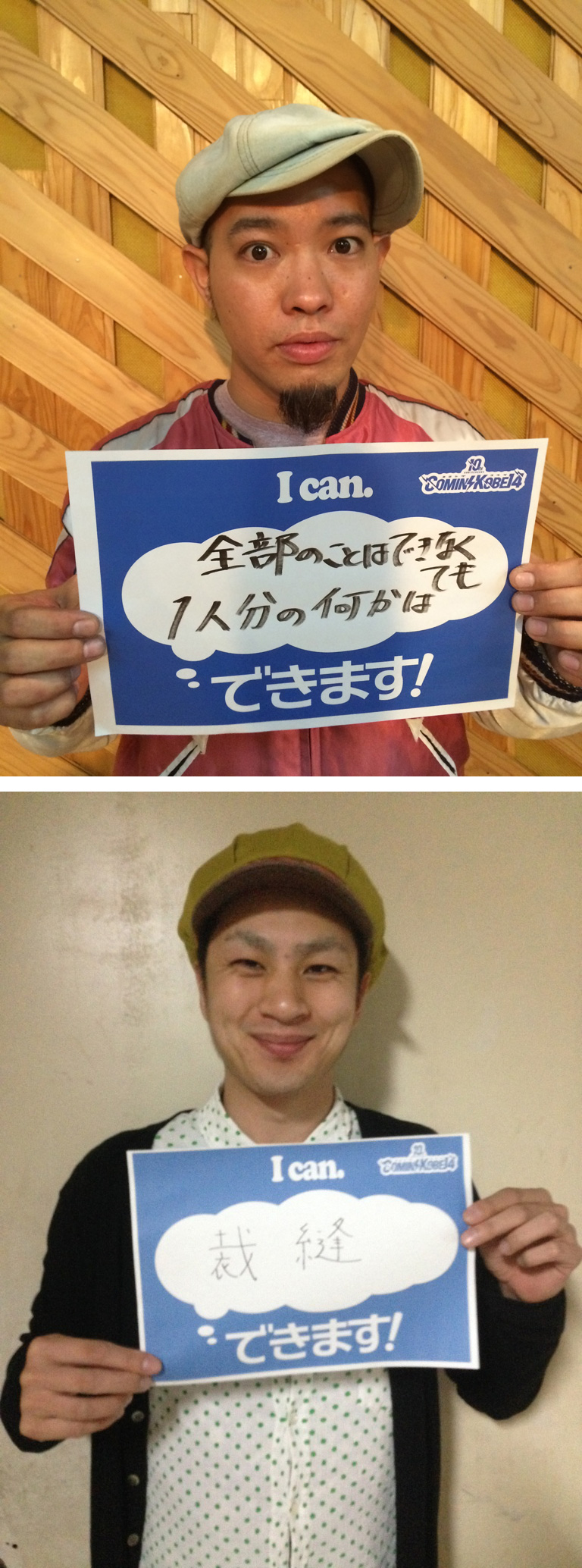 このバンダナには、できます!やります!を表明する空欄の吹き出しがあり、そこに自分が書きたい言葉を書き込める図柄になっています。首に巻いた時に調度そのメッセージが表出します。
