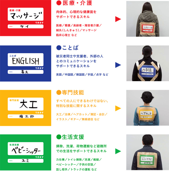 震災等の被災時には、人は互いに助け、助けられる関係になります。その時、助けを求める側がどのような支援を必要としているのか、また支援をしようとする側にはどのようなスキルがあるのか。混沌とした現場で、物資も不足し情報も錯綜する中で、双方がそれをスムーズに認識・把握することは困難です。この情報の共有不足こそが、できるだけ軽減させたいはずの混乱の種にさえなるでしょう。いざというときに互いのニーズやスキルを共有しうることこそ、効率的な減災対策の1つと言えるかもしれません。こうした学びは1.17阪神・淡路大震災以降、蓄積されてきたことのひとつで、東日本大震災においては、個々のスキルをゼッケンに示し身につける手法を導入するという発想で、この仮題克服に挑む事例もありました。(※参考事例2 参照)