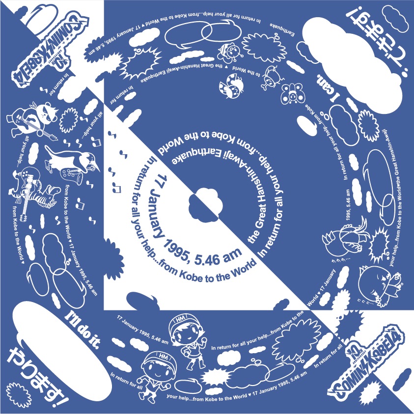 日々、ハンカチとして持ち歩けるバンダナが、使いながらに人と人のコミュニケーションを促進させ、より楽しく豊かなコミュニティを築く一助・きっかけとなる。前段までの事例でそのことの意義を理解いただけたなら幸いです。そんなバンダナのコンセプトを「減災コミュニケーション・バンダナ」と名付けてみました。ですがこのコンセプトを具現化するデザインは、まだまだ未開です。正方形のグラフィックのなかにこれを込めて成立させる発想・展開は、まだ手つかずで無限の領域がそこに広がっていると思われます。