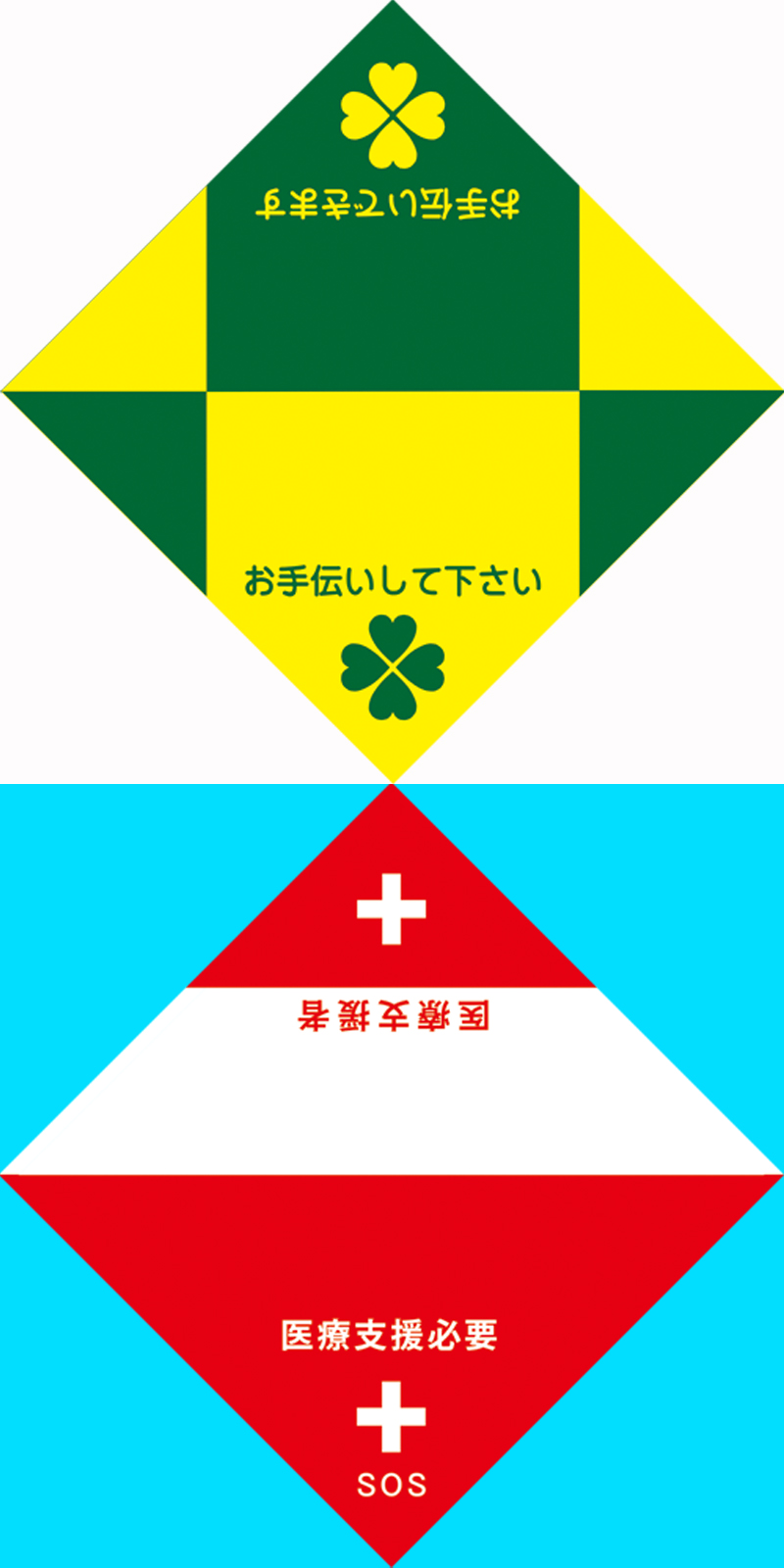 この製品では助けたい側だけでなく、助けを求める側も、それぞれ自分の立場を表明できる、リバーシブル使いの図柄で構成されています。さらにこの製品が革進的なのは、「非常時だけを視野においているわけではない」ことです。平常時にも、私たちはさまざまな助け合いが必要です。妊婦や、障害のある方などは、そのときその場で健常者と同様には振る舞えないことを見た目からだけでは表現し得ない場合があります。そのため、マタニティーマークや各種障害のシンボルマークが開発され、身につけること等も普及しています。また見れば障害があるとわかる場合でも、今助けを必要としているのか、判断できないということが多々あります。こうした時に、このバンダナは、双方が互いに一歩踏み込んでコミュニケーションをすることをサポートしてくれます。例えば「今、手が届かない(から誰か手伝って!)」というニーズを、瞬時に伝え把握しあえます。まずは平常時の暮らしの中での広がりが期待される発想と言えるのではないでしょうか。そして、このようなサインを発信しあって、普段から円滑なコミュニケーションができる社会であればこそ、非常時のコミュニケーションにおいても豊かにしあえるのではないでしょうか。(※参考事例4 参照)