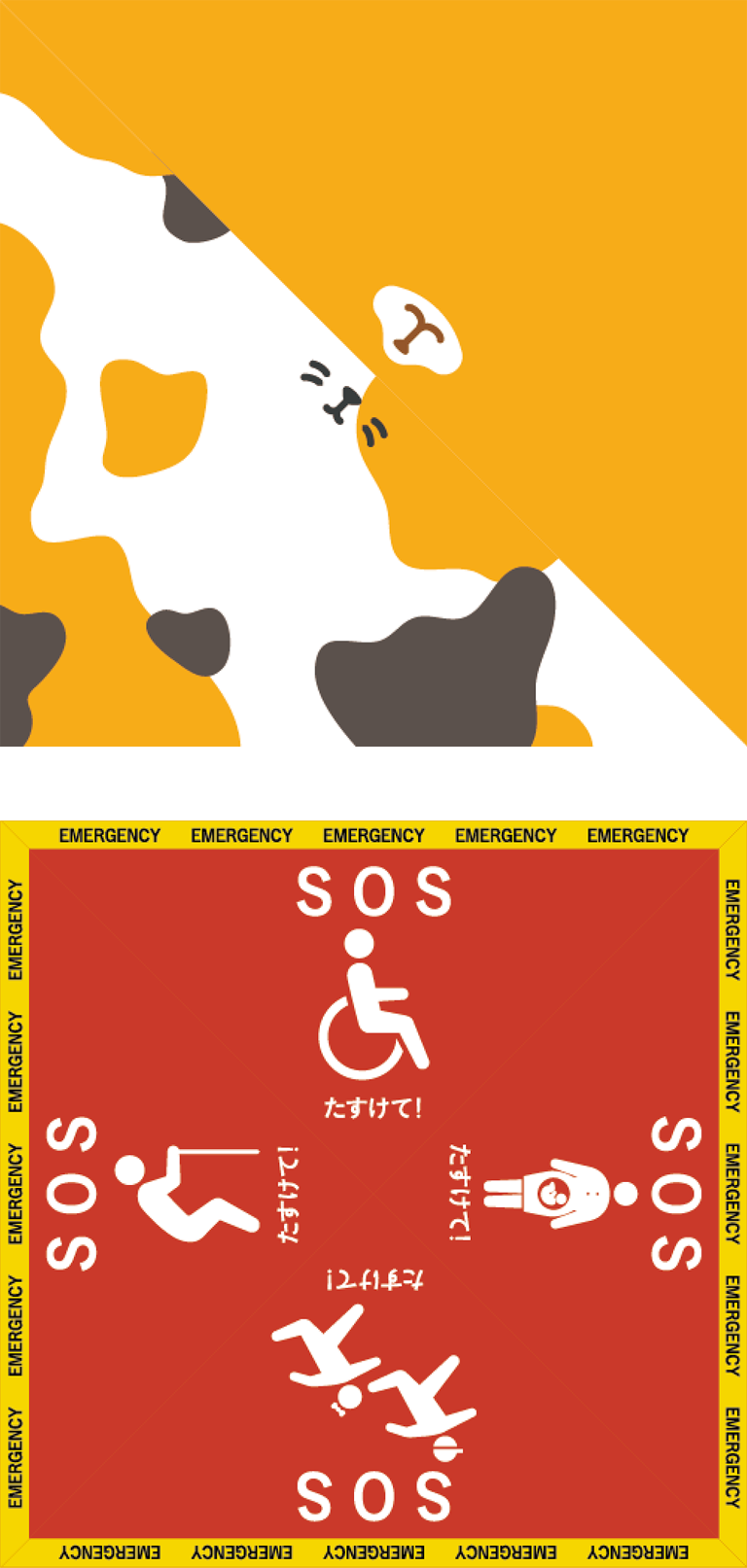 災難や緊急時の救援作業は分かりやすいことが第一で、頭に冠った三角巾のバンダナは、救援者の証しとして目立つ目印に。図柄中の白い部分は、どうゆう救援者であるのか文字を書き入れるようにして使用する。同時に普段にも使用してみたいおしゃれでかわいいデザインを目指しました。