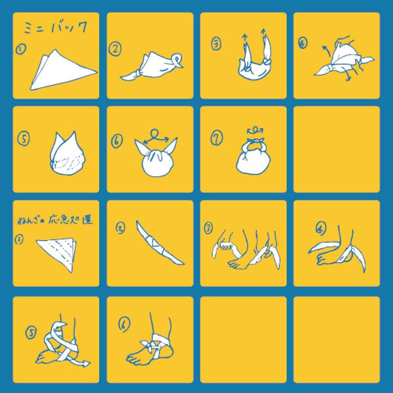 女性の視点で、避難所生活において、生理用ナプキンを入れるポーチにしたり、リップクリームやハンドクリームなど細々した小物入れに活用してもらう。捻挫固定は避難時周囲に困っている人がいた際に活用してもらいたい。青色には神経を落ち着かせる効果があり気持ちの安定を図るとともに反対色で引き締め作り方が見やすくなるよう工夫した。